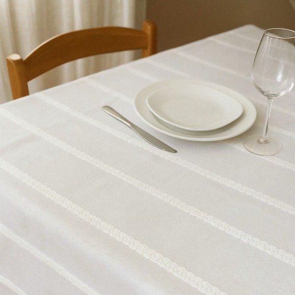 Mantel de voile con detallas de tiras de algodón formando un rayado en la tela, el mantel tiene transparencia, NO ES ANTIMANCHA. Ideal para crear mesas delicadas.