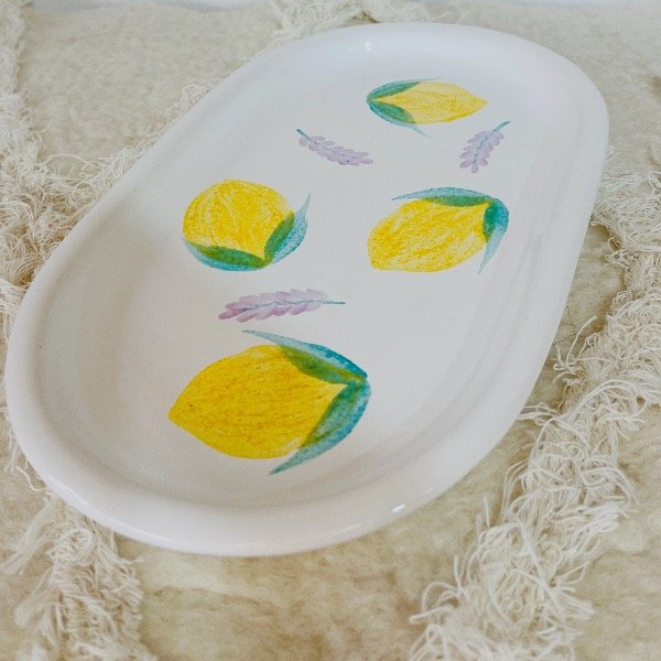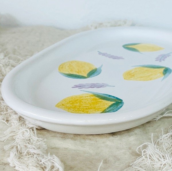 Bandeja de cerámica, forma ovalada, hecha y pintada a mano.