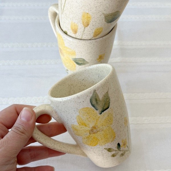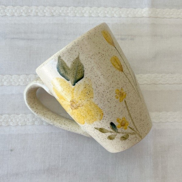 Taza de cerámica jaspeada pintada a mano, modelo bombé mediano. Medida 7 cm de diámetro por 11 cm de alto.