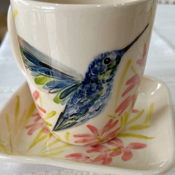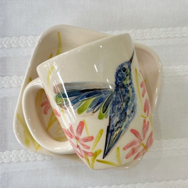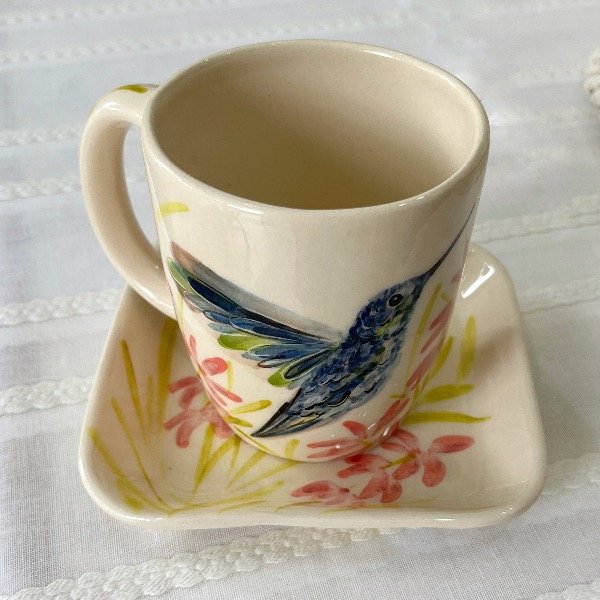Taza de cerámica artesanal bombé alta más plato cuadrado. Pintada a mano.