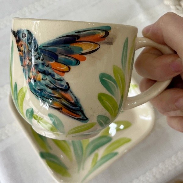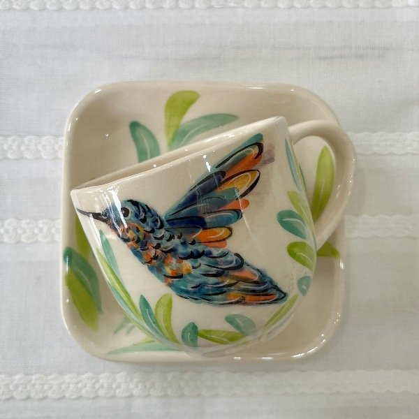 Taza de cerámica artesanal bombé baja más plato cuadrado. Pintada a mano.