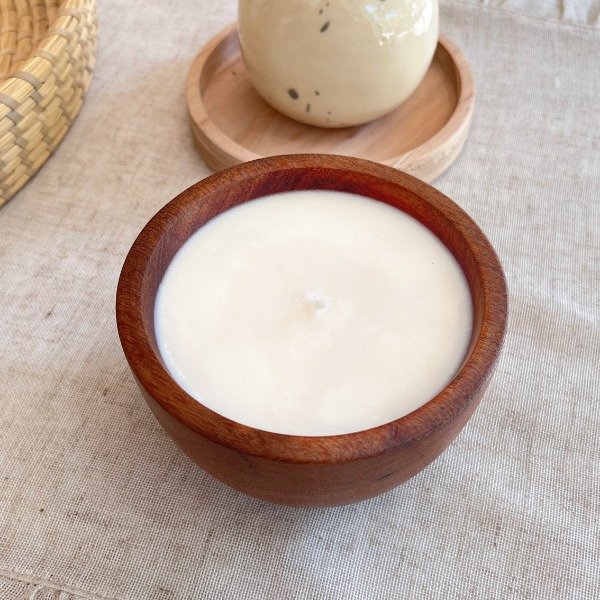 Vela de cera de soja en envase de madera. Mide 7 cm de alto por 11 cm de diámetro.