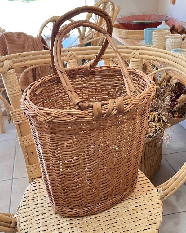 Canasta de mimbre tejida a mano, ideal para llevar tu set de mate o salir de camping.