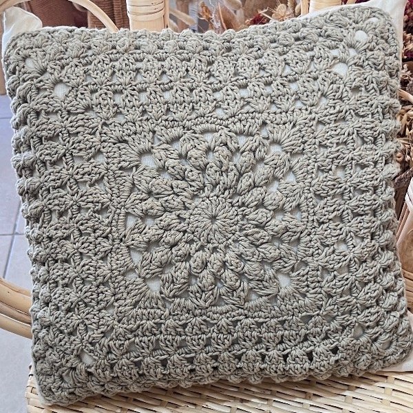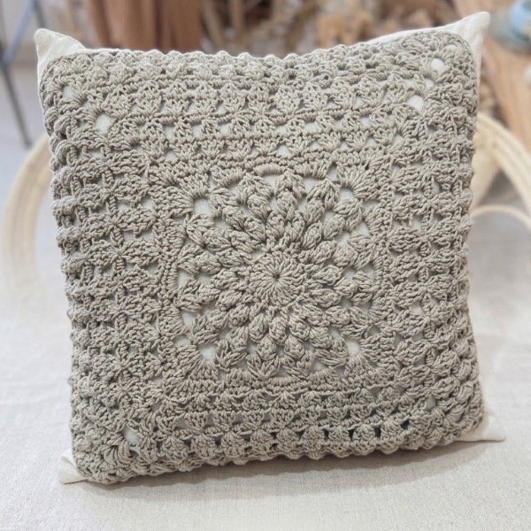 Almohadón con aplique de crochet, de un lado tiene lienzo de algodón y de la parte delantera donde tiene el aplique es de lino. Si te gustan los detalles en crochet este es ideal para vos.