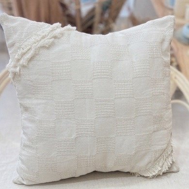Almohadón de tusor labrado con flecos color natural.