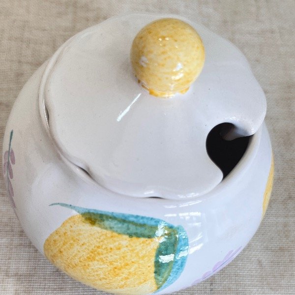 • 1 Azucarera con tapa: Compacta y delicada, con el detalle del pomo amarillo que completa el diseño.