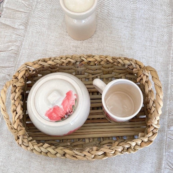 Añadí un toque cálido y rústico a tus mañanas o tardes de té con este conjunto exclusivo. Este set combina la nobleza de las fibras naturales tejidas a mano con la delicadeza de la cerámica pintada, creando una pieza funcional y decorativa para cualquier rincón de tu hogar.