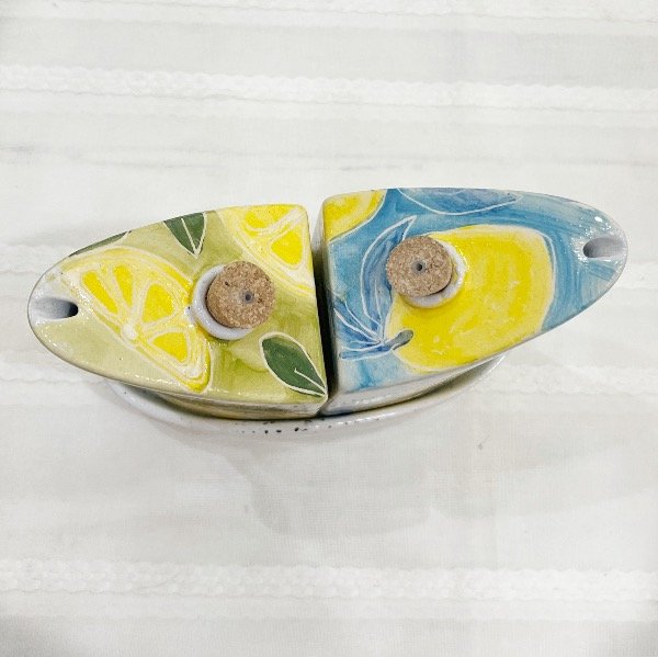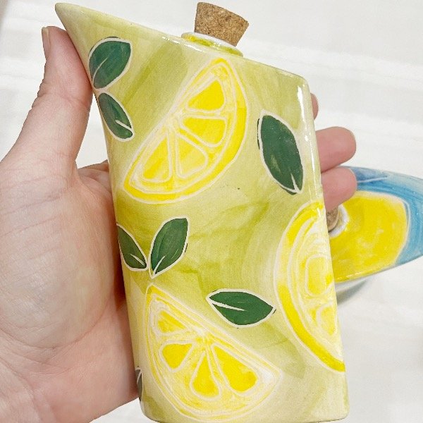 Elevá tus momentos en la mesa con este set de aceitera y vinagrera que es pura dulzura. Pintadas a mano con un encantador motivo limones en un fondo acuarela, estas piezas de cerámica artesanal no solo son funcionales, sino que se convierten en protagonistas de tu decoración.