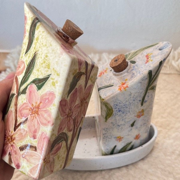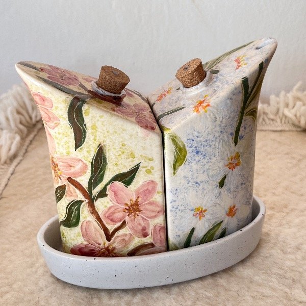 Elevá tus momentos en la mesa con este set de aceitera y vinagrera que es pura dulzura. Pintadas a mano con un encantador motivo de flores en un fondo acuarelable, estas piezas de cerámica artesanal no solo son funcionales, sino que se convierten en protagonistas de tu decoración.