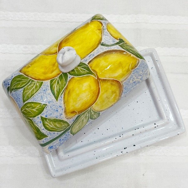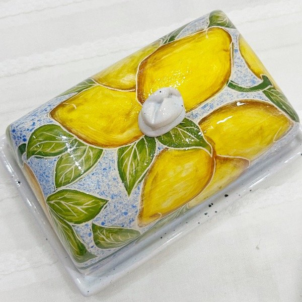 Mantequera de cerámica artesanal pintada a mano.